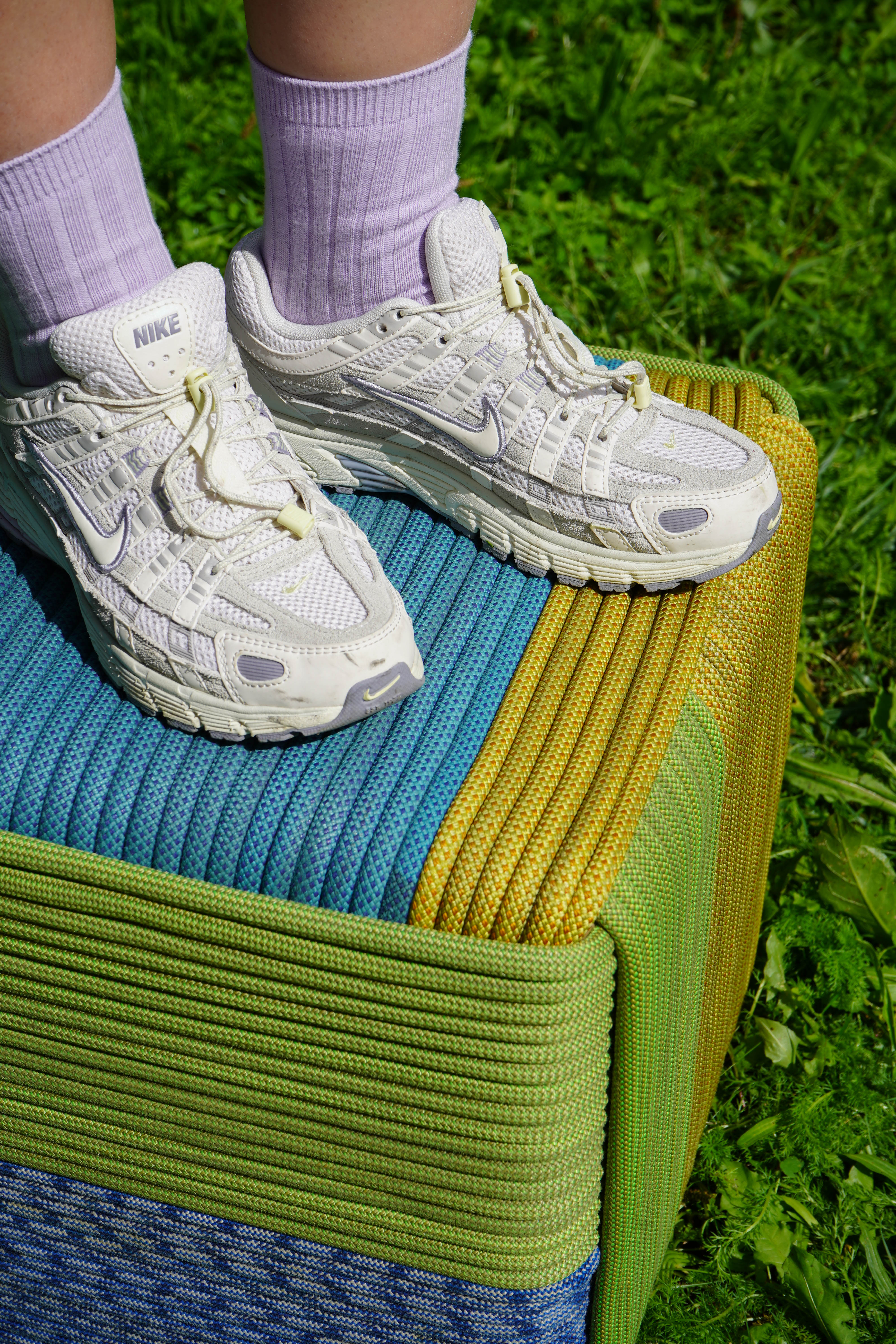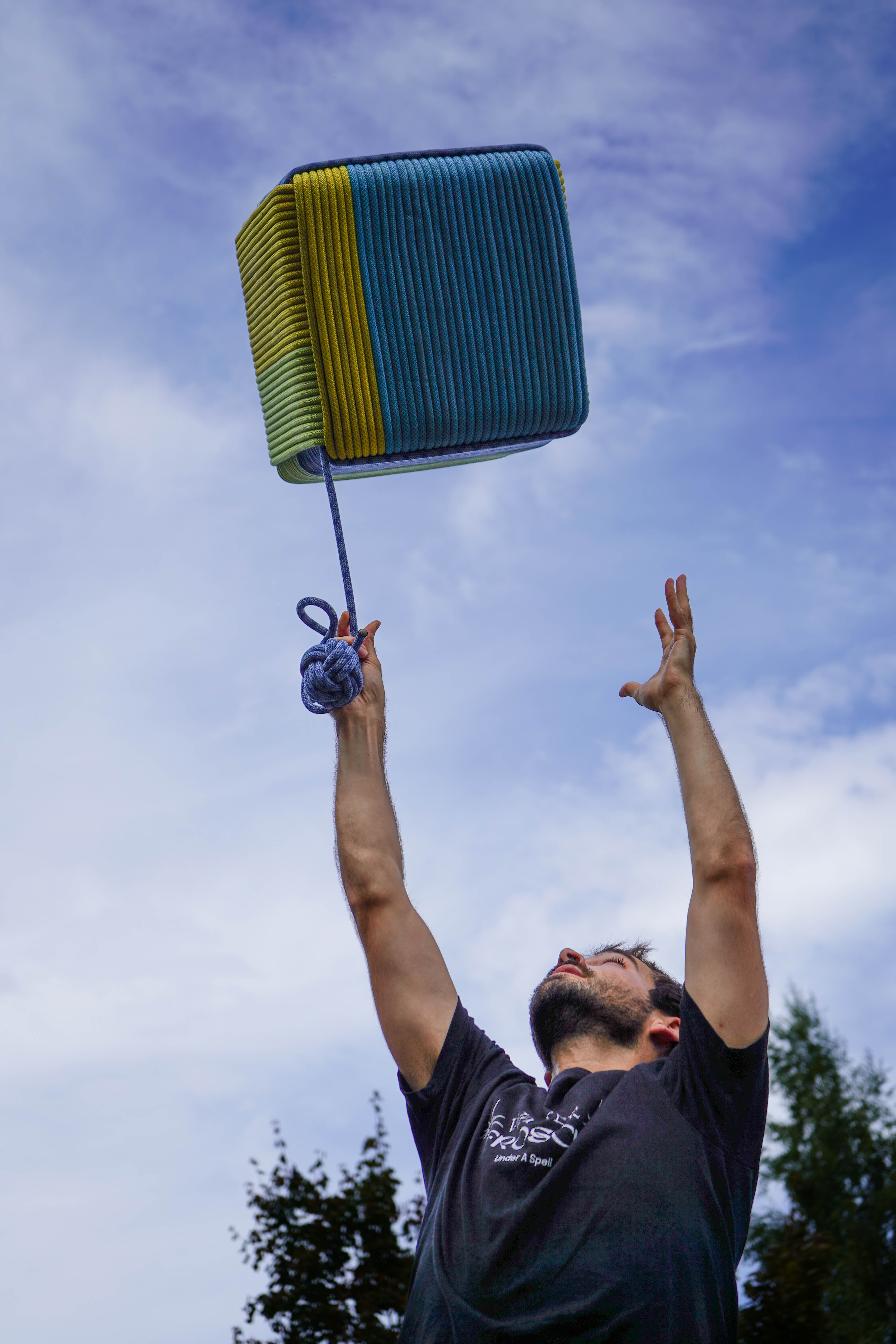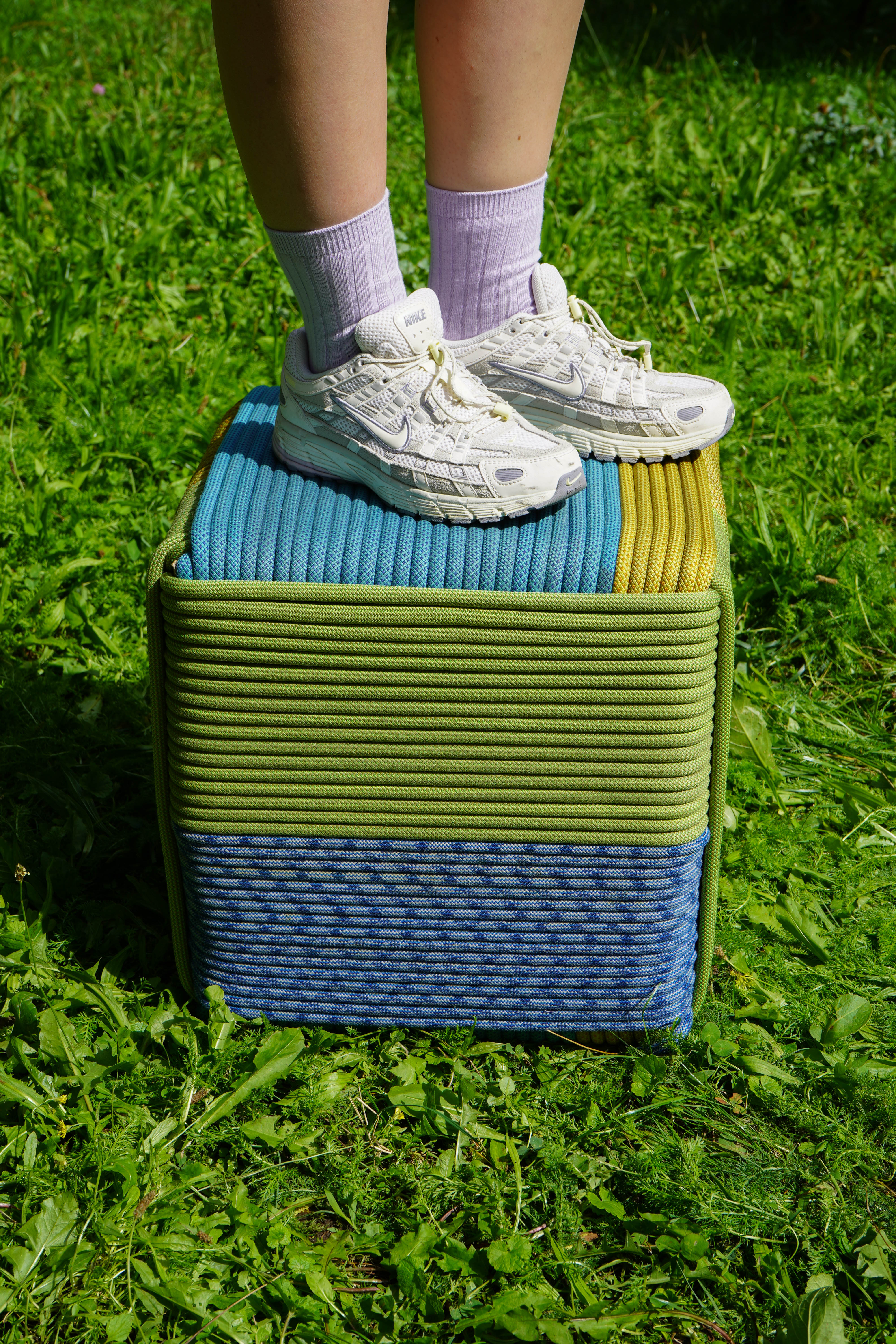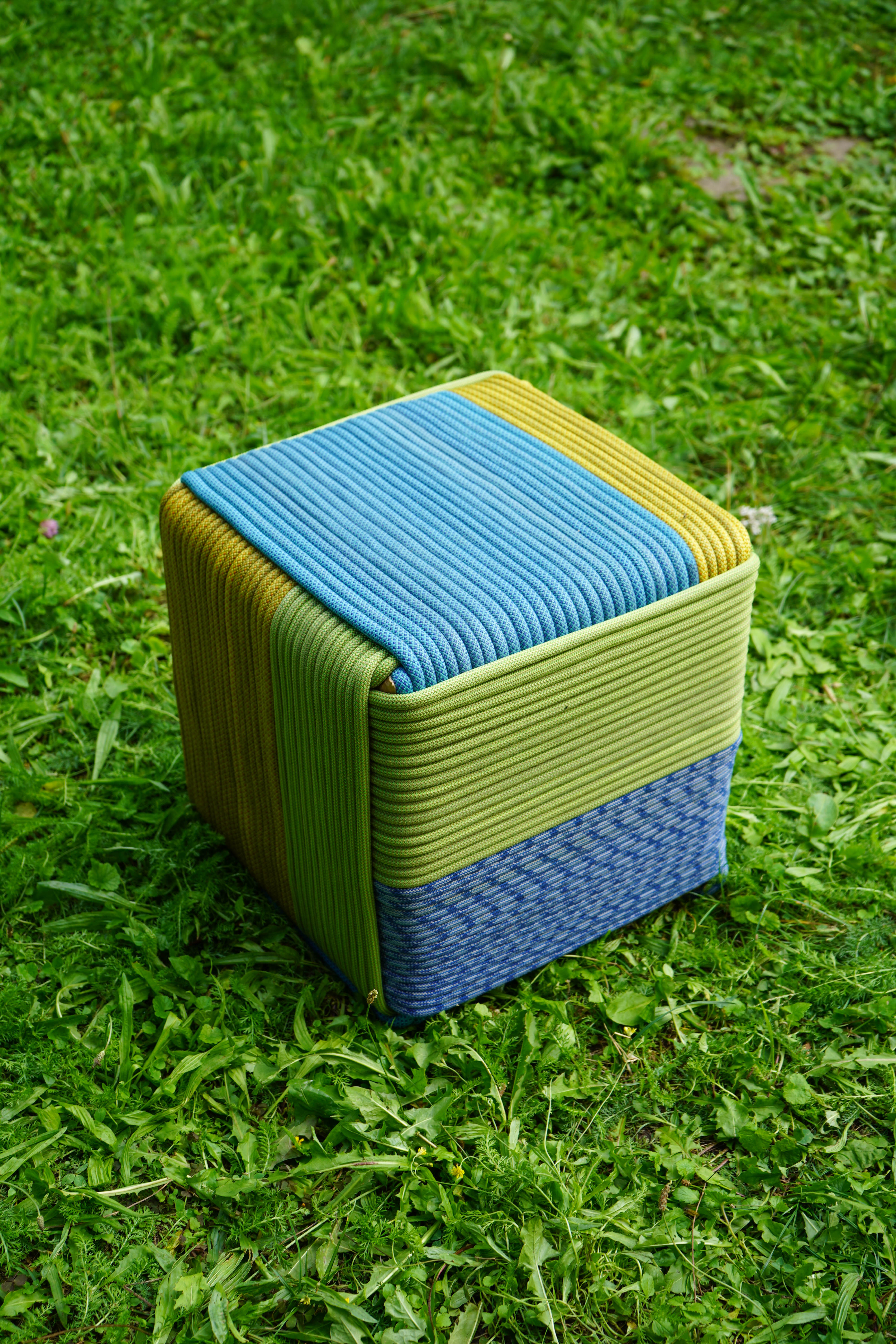 Ausgediente Kletterseile und stabile Roller-Transportkisten werden zu einem farbigen Hocker. In Anlehnung an den Affenfaustknoten werden die Seile um einen Kartonwürfel gewickelt und miteinander verflochten – ein sichtbarer Prozess, der zeigt, wie aus Alt Neu entsteht.