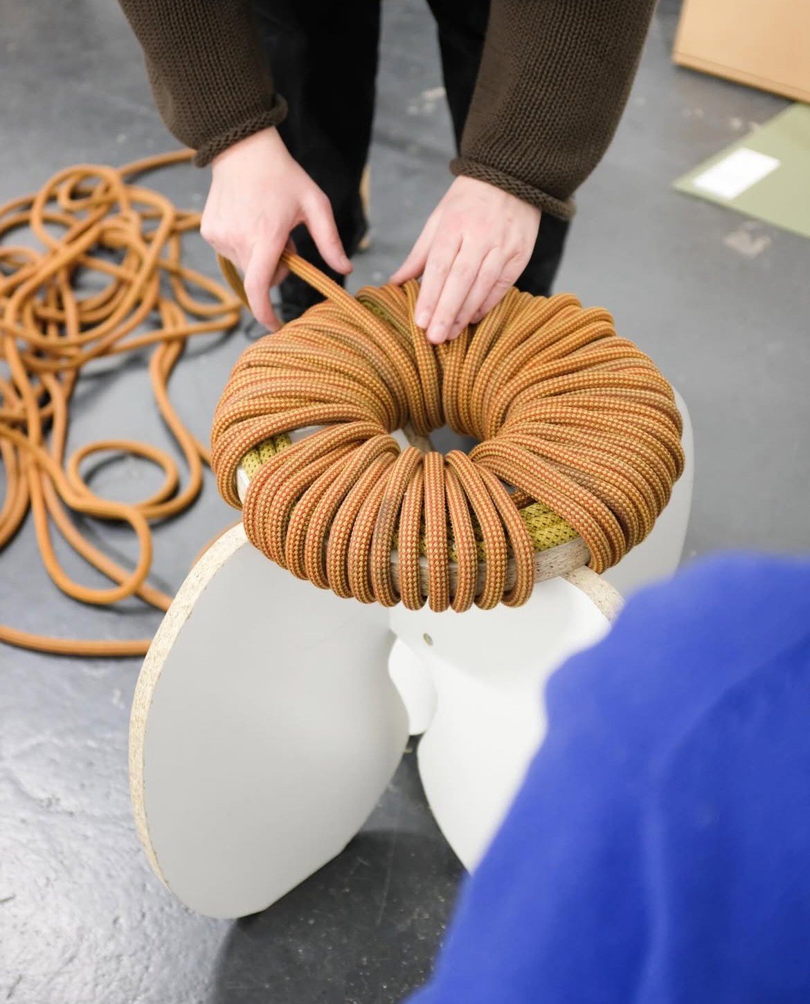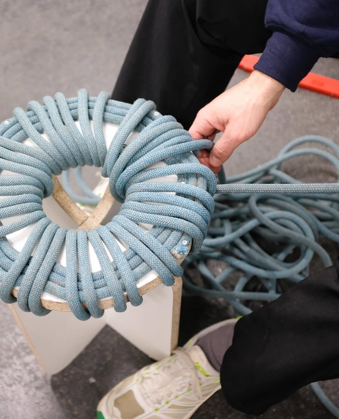 Ausgediente Kletterseile, Farbreste und Altholz werden zu einem einzigartigen Hocker. Der Donut Hocker zieht in jedem Café und Wohnzimmer die Blicke auf sich und zeigt spielerisch, wie aussortierte Restmaterialien durch kluges Design neuen Glanz erhalten.